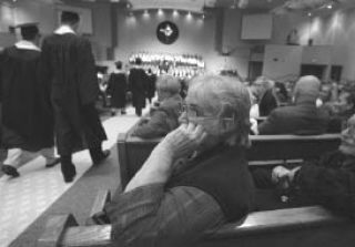 Ginger Hart appears emotional as she waits for her grandson Raymond Zoellick to walk through the isle at the Cedar Park Christian School graduation ceremoney.