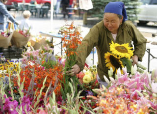 Kaying Chang makes a bouquet to sell at her flower booth Aug. 8 during the Bothell Farmers Market at Country Village.