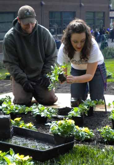 University of Washington, Bothell gardener Richard Klein watches as senior and Associated Student Body President Xheni Diko plants the first purple petunia today at the school’s Earth Day Celebration, “Digging with the Dawgs,” on the campus W.