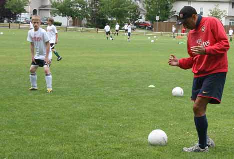 Arsenal Soccer Schools director of coaching Peter Kirov shouts directions as Nathan Willet prepares to get in on the action during this morning's session at Forsgren Park in Bothell. Kirov and coaches from the Hawaii Arsenal branch are putting on the two-week camp through the Northshore Youth Soccer Association. Today