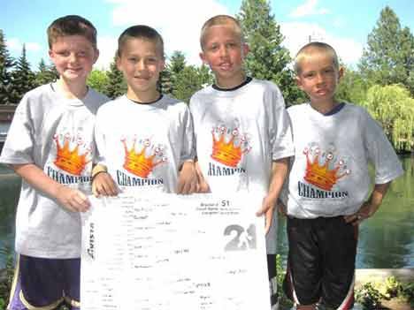 The team of, from left to right, Ryan Gibson, Cage Schenck, Zachary Shimek and Owen Klee won its first Hoopfest championship with an undefeated record recently in Spokane. The third-graders-to-be are from Bothell, Kenmore and Woodinville.