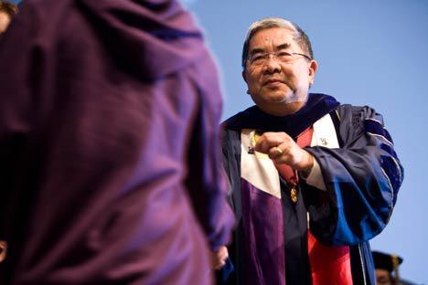 University of Washington, Bothell Chancellor Kenyon S. Chan presents an incoming freshman with a UW pin as a memento of the first day of class during Tuesday’s convocation ceremony.