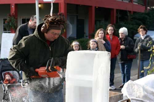 Artist David Westberg attracts a crowd as he begins to cut away on a block of ice during the “Taste of the Holidays” event Nov. 20 at Bothell’s Country Village. Westberg usually works with wood. It took only a few minutes before his icy nutcracker began to take shape.