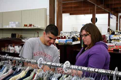 Gathering up unused clothes hangers from the aisles in the St. Vincent DePaul Thrift Store in Kenmore, Bo Daane, 19, proudly wears a Washington State University T-shirt.