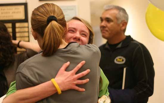 A big hug after Inglemoor’s Lystad signs her letter of intent