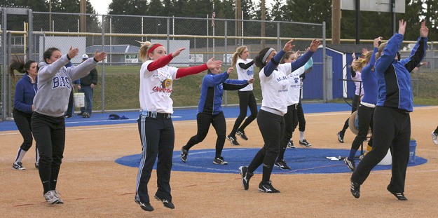 The Cougar softball team does stretching exercises in unison prior to a practice earlier this week at the Bothell High fastpitch field. Led by third-year coach Rob Luckey