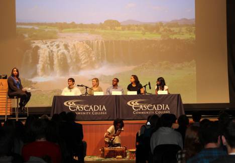 The Tuesday evening event was intended to celebrate the book-drive efforts and raise awareness among students and community members about the value of global and community engagement. The evening included a traditional Ethiopian coffee ceremony and several dance performances by members of Seattle’s Ethiopian Community Mutual Association. A panel of community college students, moderated by Cascadia instructor Danielle Powell, discussed the realities and benefits of student engagement.
