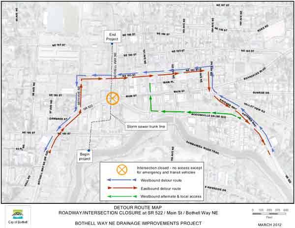 The main intersection in downtown Bothell — State Route 522/Main Street/ Bothell Way Northeast — will be closed from 9 p.m. to 5 a.m. on March 17 and 18 for the installation of a storm sewer trunk line crossing. Roadway operations will remain normal during daytime hours. Emergency vehicles and transit buses will have access through the intersection during the closure. All other traffic will be detoured around the closure.