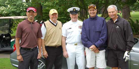 Inglewood Golf Club in Kenmore hosted “Military Appreciation Day” on June 9 to honor 60 active military personnel from Navy Station Everett. Pictured, left to right are: Navy member (not identified); Denny Vaughan, Inglewood Golf Course member and retired admiral; Rear Admiral (Ret.) United States Navy Josh Dugan, command master chief Navy Station Everett; Al Irvine and Webb Bates, Inglewood Golf Course members.