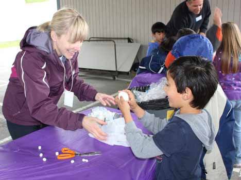 Lockwood Elementary kindergartener Akash Singh proudly examines his egg with PTA volunteer Leaanne Meschke at the recent Lockwood PTA Egg Drop.