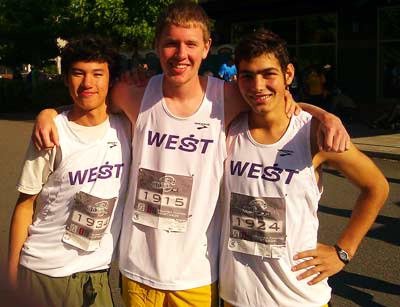 From left to right, Inglemoor High’s Chris Wilson, David Hamilton (Inglemoor’s top finisher in 17 minutes, six seconds) and Evan Patrick participated in the annual East/West All-Star Cross Country Race on July 7 at the Run of the Mill 5K in Mill Creek. Bothell High’s Nathan Conrad also participated in the event.