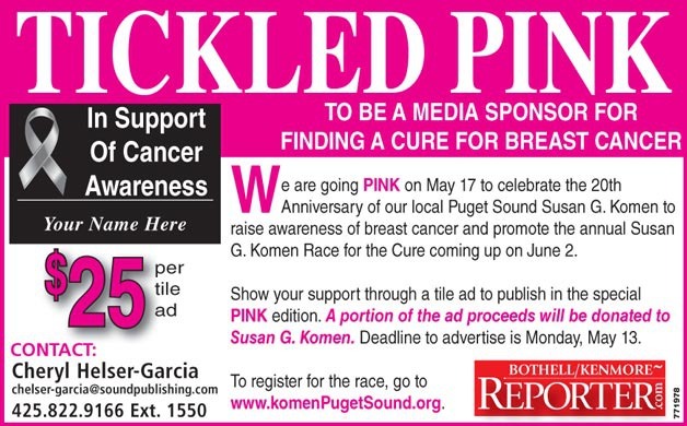 The Bothell Reporter is “going pink” for our May 17 print edition to celebrate the 20th anniversary of our local Puget Sound Susan G. Komen, and to raise awareness of breast cancer and promote the organization’s annual Race for the Cure on June 2.