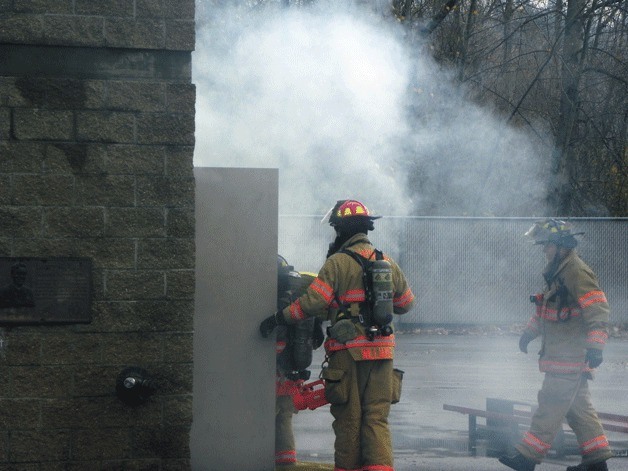 On the day of the study, the eight male and one female participants were subjected to a stringent mock fire drill, wearing a self contained breathing apparatus and carrying 70 pound packs up and down stairs for two 30-minute sessions of mock firefighting in a building with a live fire.