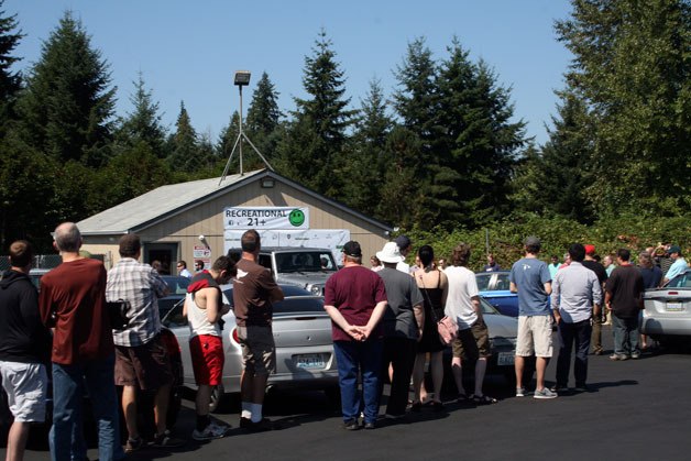 A line of around 80 people stretched outside Herbal Nation, a marijuana retail store that opened its doors in unincorporated Bothell on Monday.