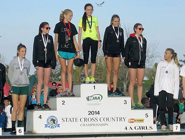 Inglemoor senior Amber Rose stands on the podium after receiving her medal for second at the State cross country meet in Pasco
