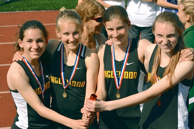 The girls 3,200-meter relay team of Rebecca Crawford, Katie Diekema, Bailey Fjelstul and Rebecca Ledsham broke the school record to place third in a time of 9:41.59.