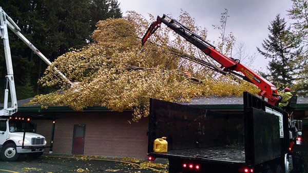 Four trees fell on the roof of Bear Creek Elementary School in Woodinville, which did not puncture the roof and no injuries were reported. Crews are working to clear the trees.