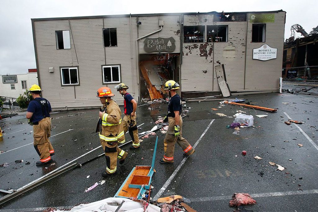 The fire began around 2:45 a.m. on July 22 in the under-construction Mercantile building and completely consumed the wooden part of the structure. The four-alarm fire hopped the road and then destroyed the Bothell Mall building to the west. Around 20 businesses along Main Street sustained water, heat or fire damage during the incident.