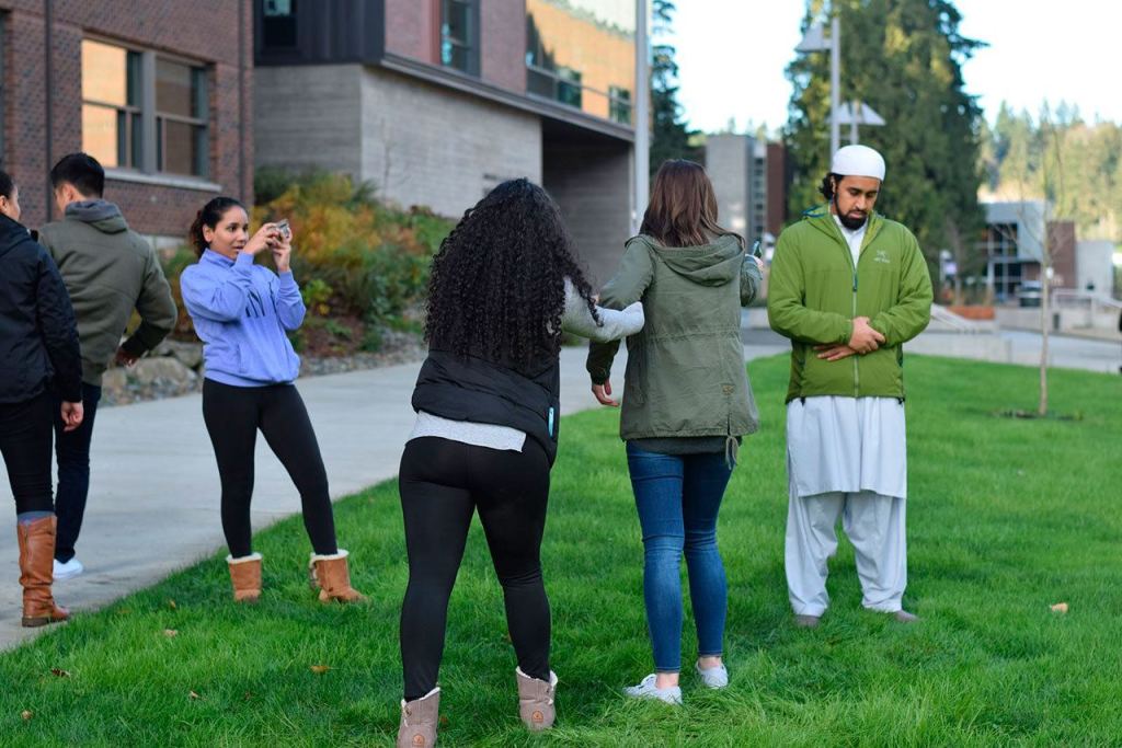 Scenes of Muslims being hit with a bottle, kicked or splashed with coffee are accompanied by audio from newscasts from 9/11 and hate crimes. Other scenes show a Trump political rally, and the video closes with a group of Muslims praying “shoulder to shoulder” as they are surrounded by a protective circle of UW Bothell and Cascadia College students, faculty and staff.