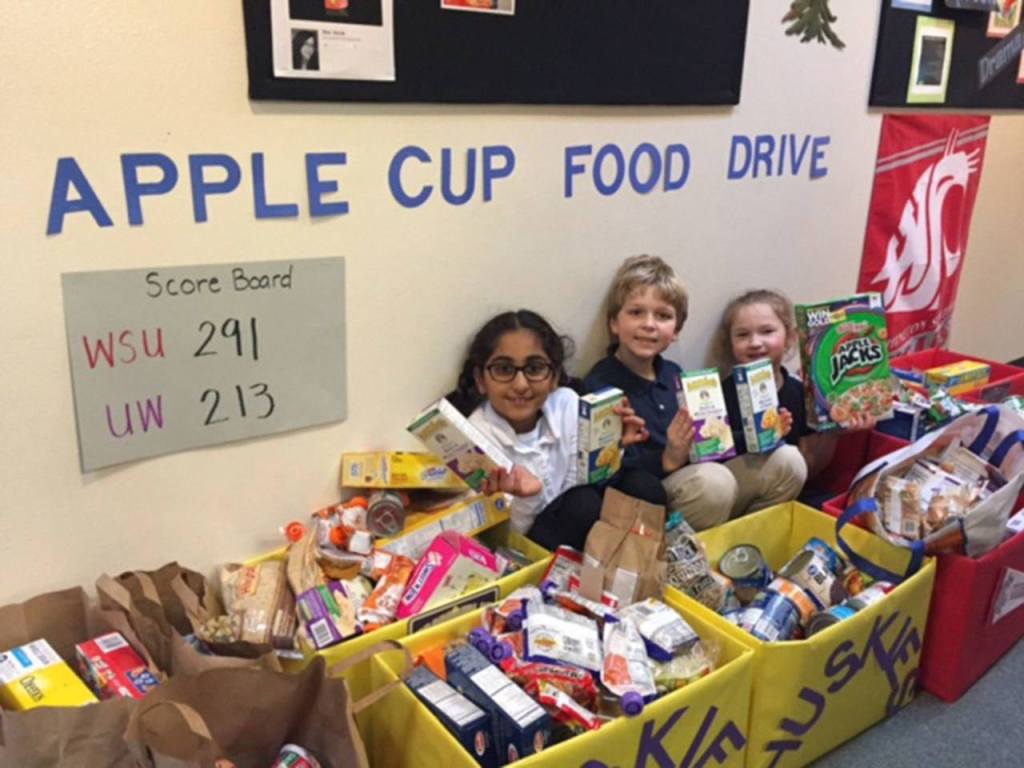 The elementary students collected 486 pounds of non-perishable food items and donated them to the Maltby Food Bank as part of the school’s annual Apple Cup food drive. With the major rivalry between the Washington Huskies and the Washington State Cougars during November, students and parents showed their support for their favorite team by donating to separate boxes labeled with each team’s name.