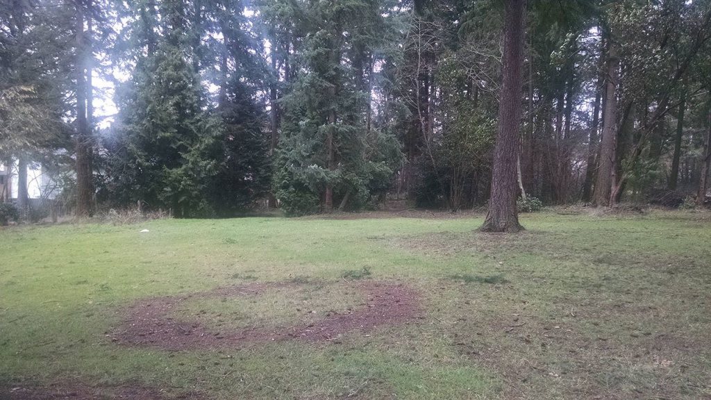 The park has an open lawn along 119th Avenue NE near the intersection with NE 153rd Place, which leads into undeveloped wooded space with informal trails.