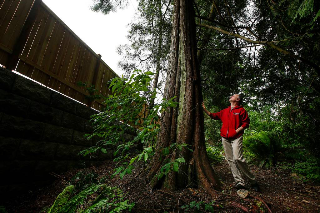 Along the other property line, Brian Bansenauer, president of Songaia’s condo association, stood next to a western red cedar they had worked with the developer to save.