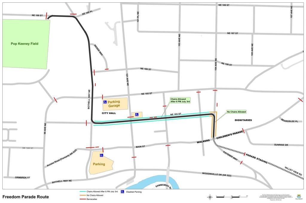 Due to the construction and the new route, the city is advising parade watchers who traditionally put chairs out early to be aware of new restrictions on chair placement. Chairs may not be placed on N.E. 183rd Street and the construction zones of Bothell Way N.E. until July 1. Chairs may not be placed near the intersection of 104th Avenue N.E. and N.E. 183rd Street for safety reasons due to the tight turn for parade vehicles at that corner.