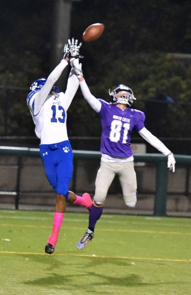 Bothell’s Da’ Vicious Wilson snags a touchdown pass as North Creek’s John McAteer defends. Courtesy of Greg Nelson