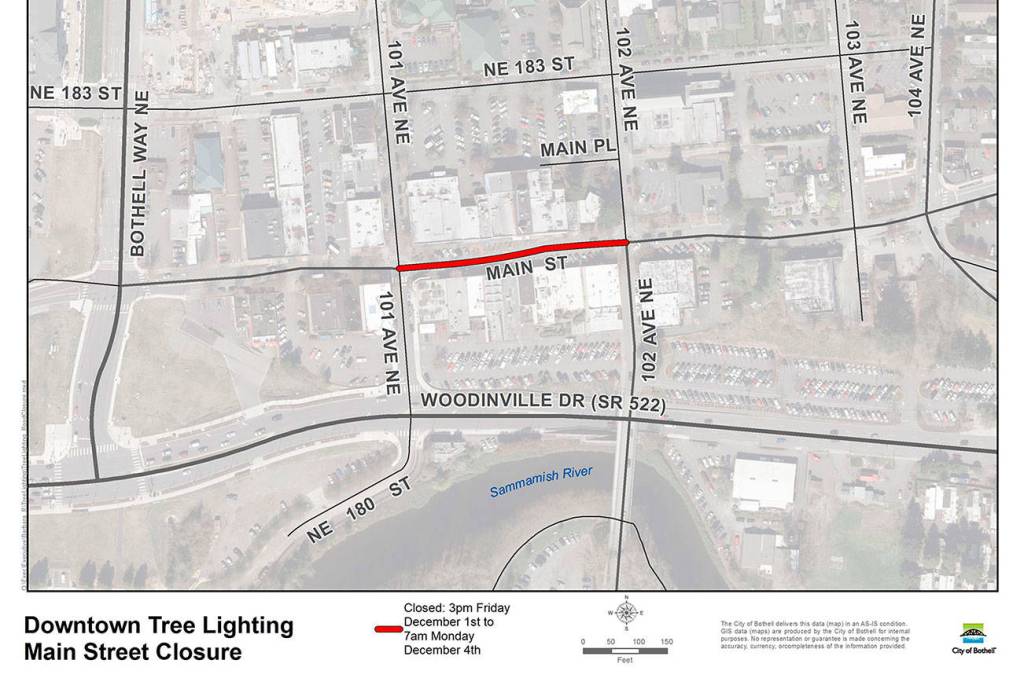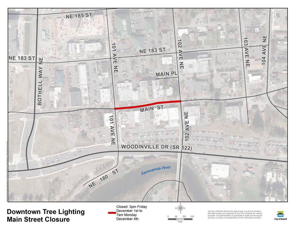 For safety and to minimize impacts of Main St. construction during Sunday’s Tree Lighting Festival, the City will close one block of Main Street to vehicles in downtown Bothell this weekend.