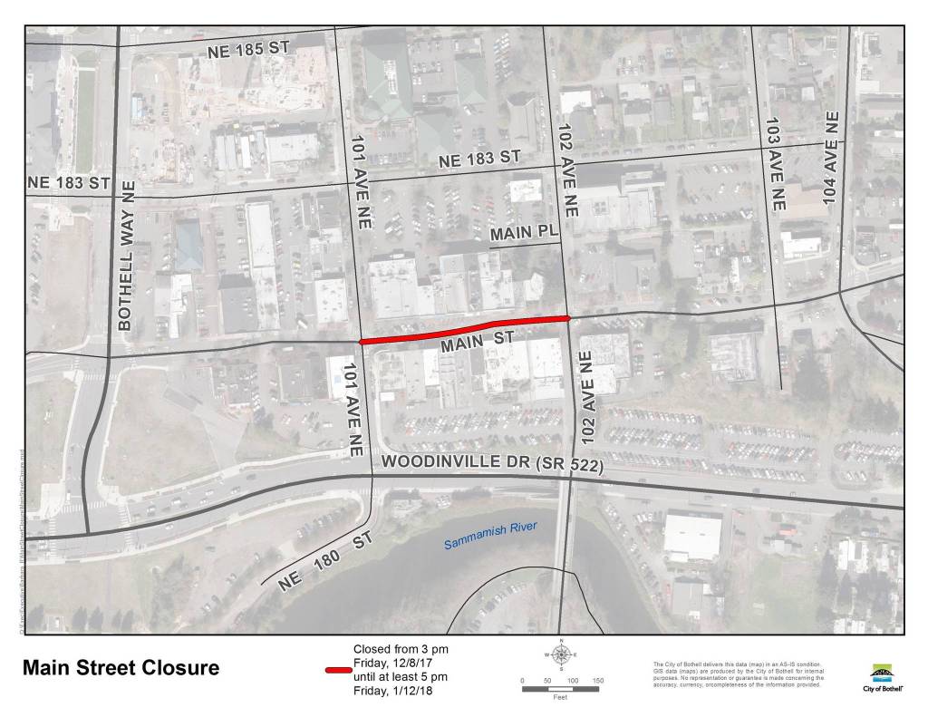 Bothell will close Main St. between 101st Ave. and 102nd Ave. to vehicles in downtown Bothell beginning on Friday at 3 p.m. until at least Jan 12 around 5 p.m.