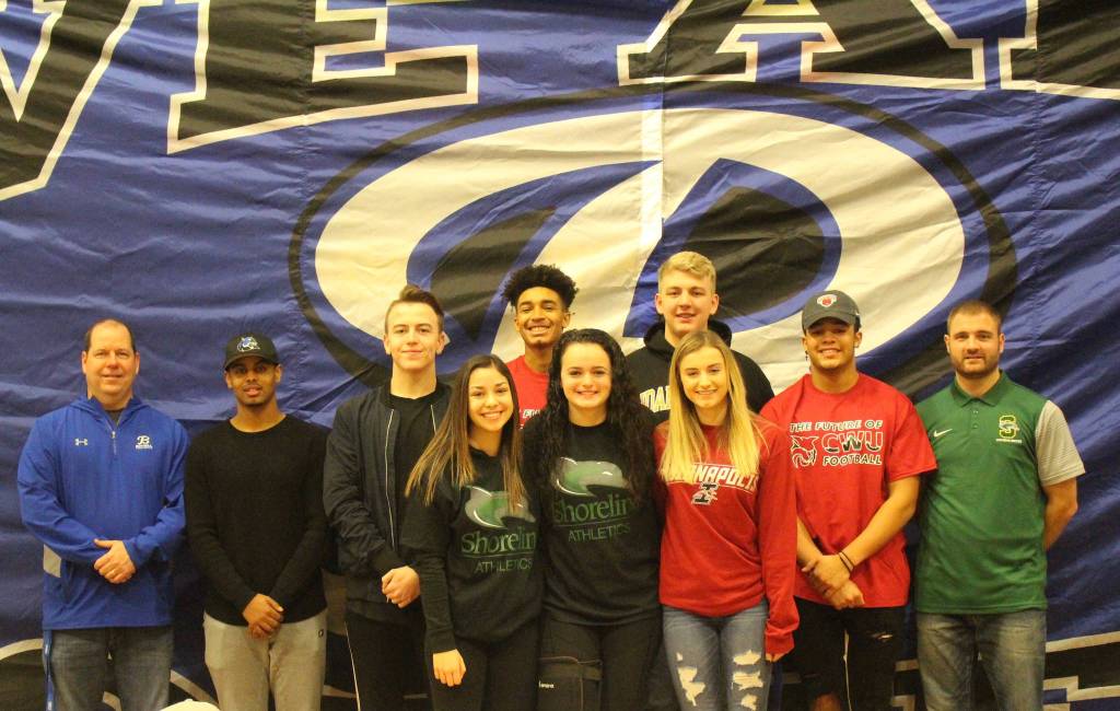 Eight Bothell High seniors committed via letters of intent to play sports at their chosen colleges on Feb. 7. Pictured back row, left to right: Football coach Tom Bainter; Eyakem Asmelash (football) Culver Stockton College; Drew Nicholson (football) Simon Fraser; Da’Vicious Wilson (football) Central Washington; Hunter Smith (football) Idaho State; Jaelen Percival (football) Central Washington; and girls soccer coach Shaun Warner. Front row, left to right: Jacy Delgado (soccer) Shoreline; Emily Heffernan (soccer) Shoreline; Sydney Nolan (soccer) University of Indianapolis.
