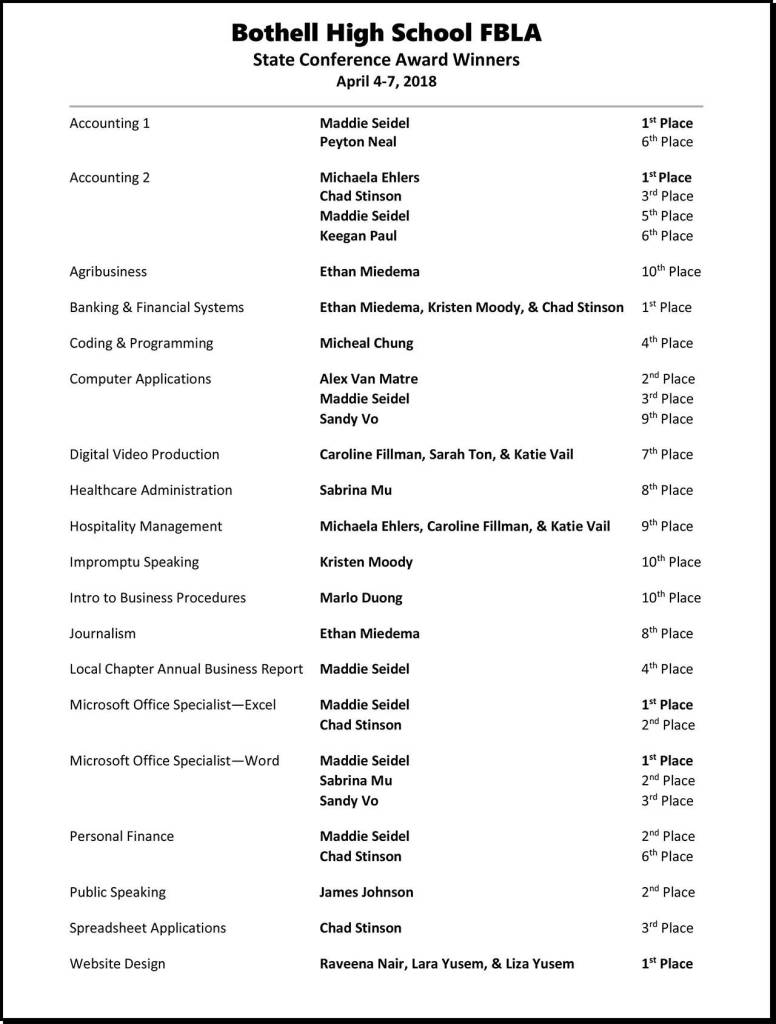 Bothell High School’s FBLA competed at the State Leadership Conference April 4 through 7 in Bellevue and won 29 awards with six students winning first place.