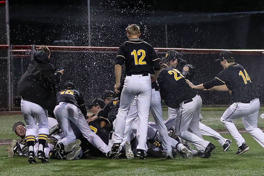 Members of the Vikings roster succeeded in pouring a congratulatory bucket of ice on Bishop’s back following Inglemoor’s monumental 7-3 victory against the No. 1-seeded Skyline Spartans in the Class 4A KingCo championship game on May 9 at Bannerwood Park in Bellevue. The Vikings clinched a berth in the Class 4A state tournament courtesy of the triumph against Skyline. The Vikings will play Skyview at 1 p.m. Saturday in the state tourney at Everett Memorial Stadium.