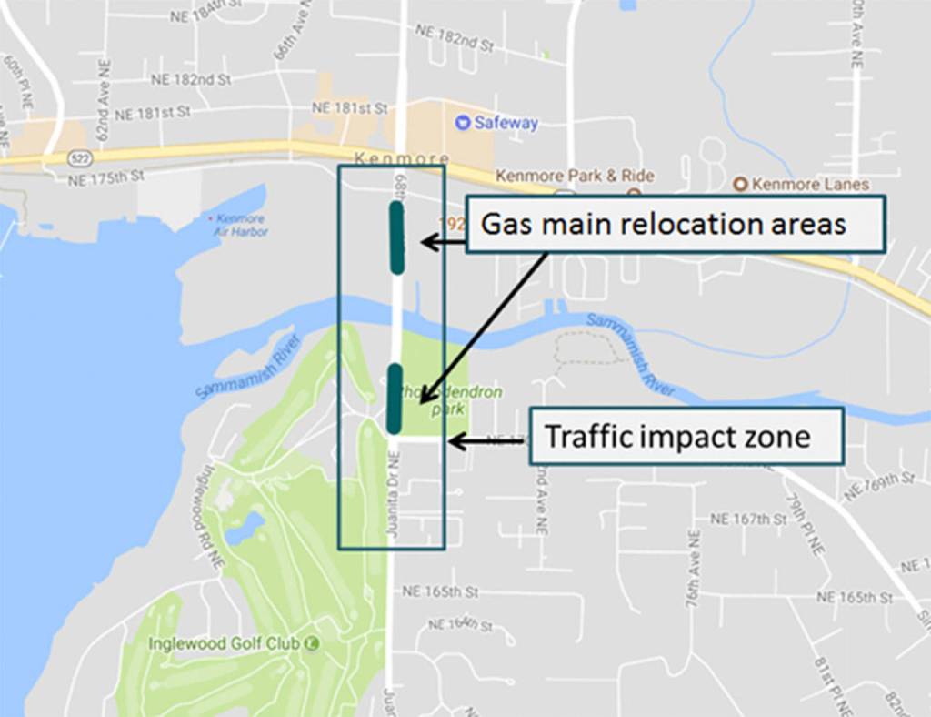 In preparation for the city of Kenmore’s West Sammamish River Bridge replacement project, Puget Sound Energy (PSE) must relocate sections of natural gas main to the north and south of the bridge in Kenmore, which will result in lane closures during construction hours.