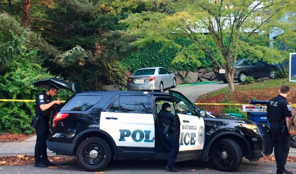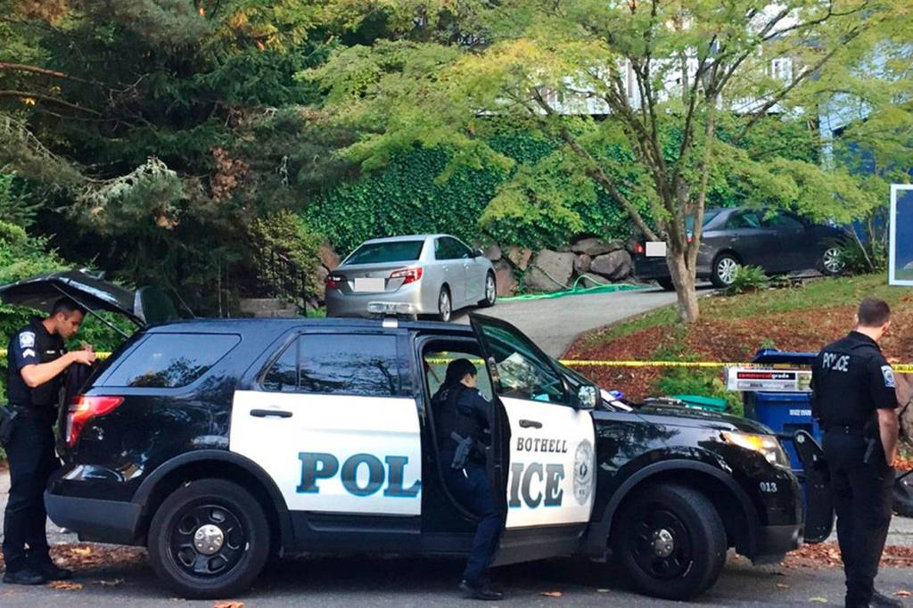 According to photos taken by police, at least four officers were assisting investigations at the crime scene in southern Bothell, near the city’s border with Kirkland, west of I-405.