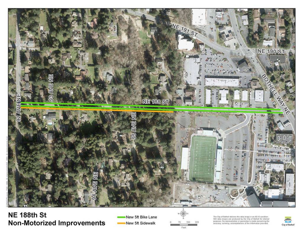 The project proposes a safer connected pedestrian and bike route from Bothell High School to Bothell Way Northeast via Northeast 188th Street, including 1,500 linear feet of sidewalks, 4,600 linear feet of bike lanes and seven curb ramps.