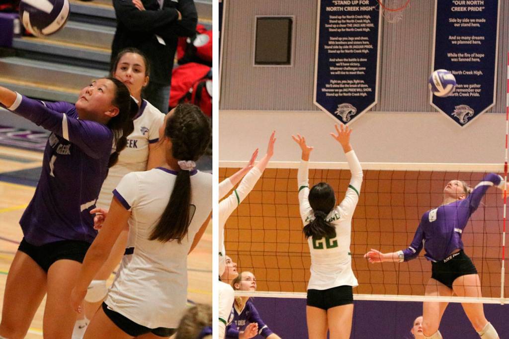 North Creek libero Alisa Kim, left, and outside hitter Gabby Kepley, far right, were named to the Washington State Volleyball Coaches Association class 4A first-team squad. Staff photos by Andy Nystrom
