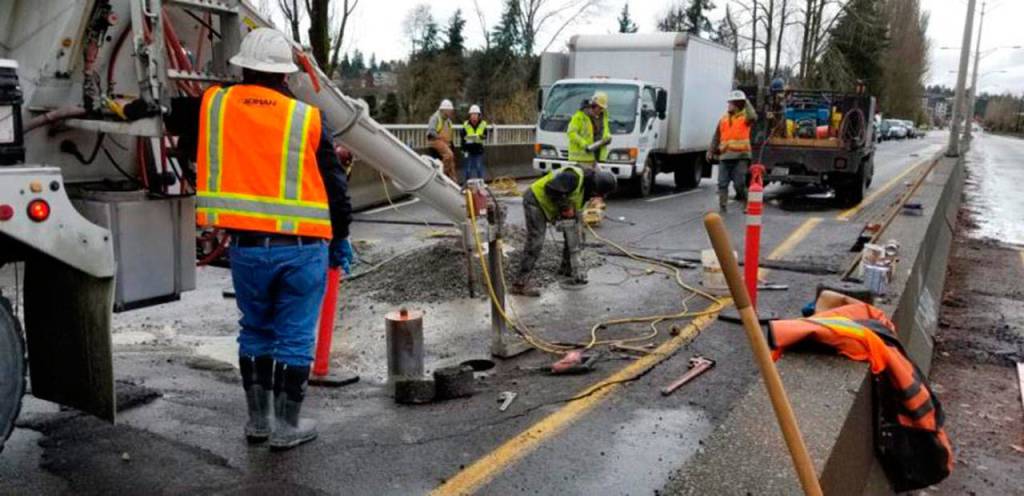 Northshore Utility District contractors work to repair sinkhole on southbound lane of 68th Avenue Northeast bridge. Photo courtesy of Northshore Utility District