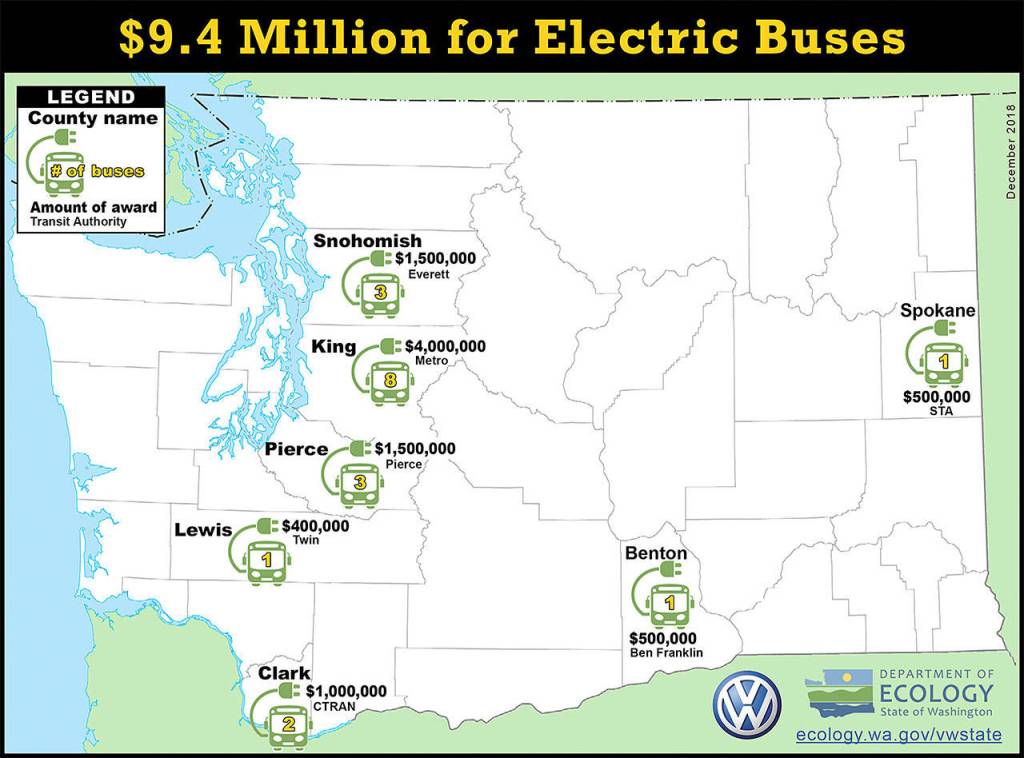 The Department of Ecology has awarded $9.4 million from the VW settlement to purchase 19 electric transit buses in Lewis, Benton, Spokane, Clark, Pierce, Snohomish and King counties. Courtesy of Department of Ecology.