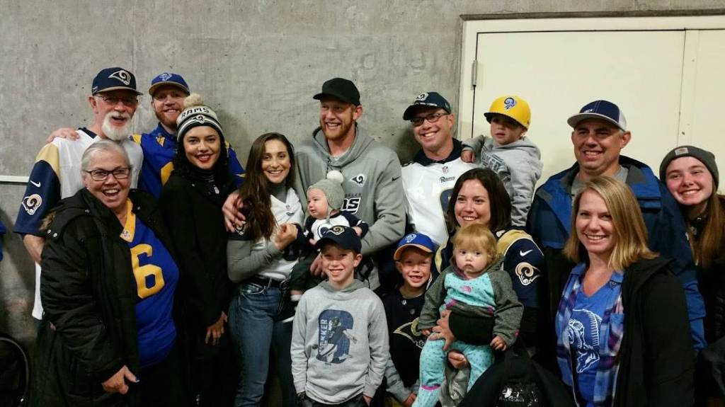 Johnny Hekker, middle in blue hat and gray sweatshirt, with most of his family at the Rams/Seahawks game in 2018. Photo courtesy of Joy Hekker