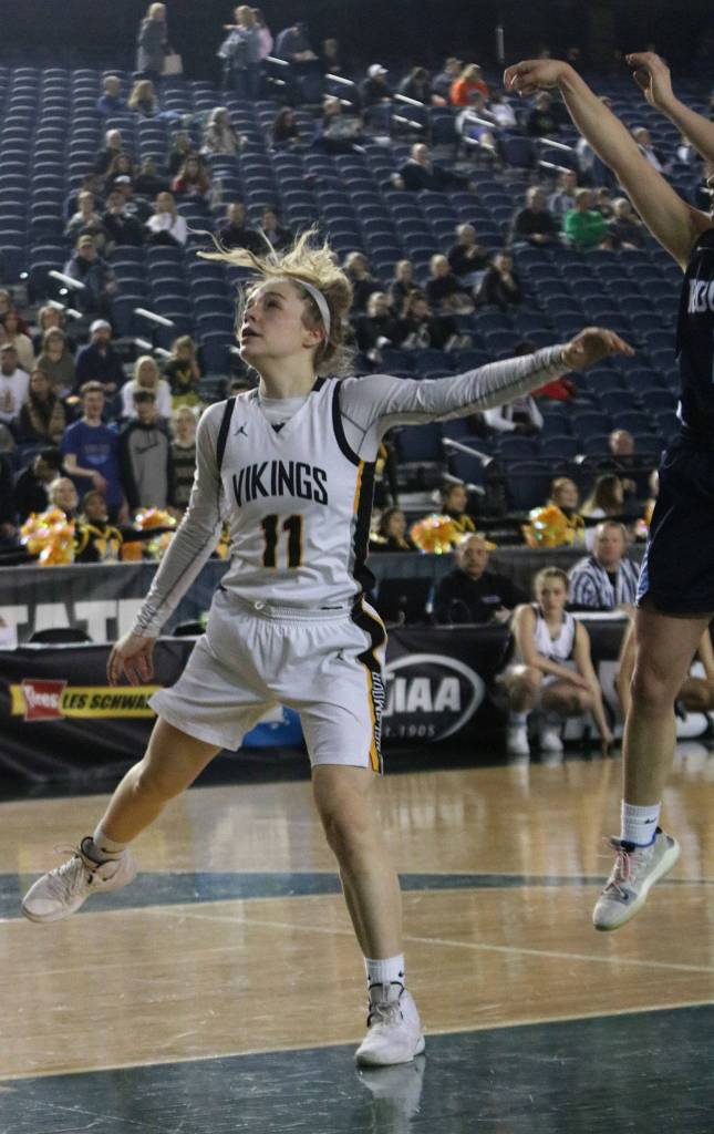 Eastlake beat Inglemoor, 65-46, in 4A state girls basketball action tonight at the Tacoma Dome. The Viks will play Central Valley at 12:15 p.m. tomorrow, with the winner advancing to play for fourth place on Saturday. Pictured is Inglemoor’s Lucy Young, taken from last night’s win against Rogers. She and teammate Jenna Troy had 16 points each against Eastlake.