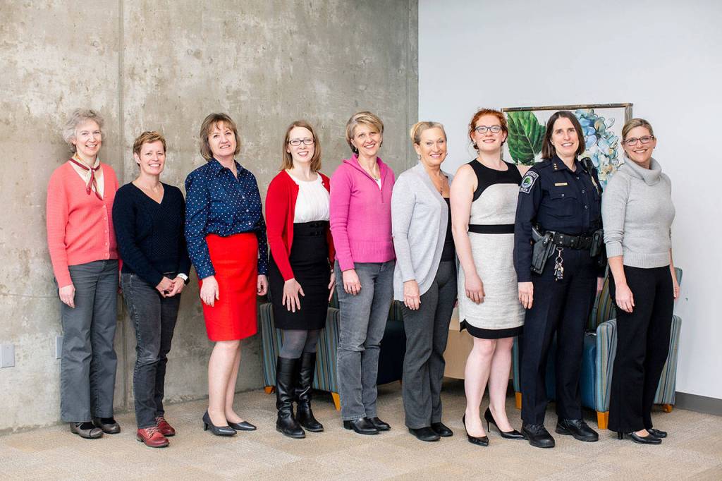 “I asked several women leaders in the city of Bothell if they would mind posing for a photo to recognize the day and the contributions women have made and are making,” communications officer Barbara Ramey said in an email. “I was planning to take the photo (not be in it!) until Mike Johnson [of the Bothell Police Department] offered to help out and brought a volunteer photographer.”