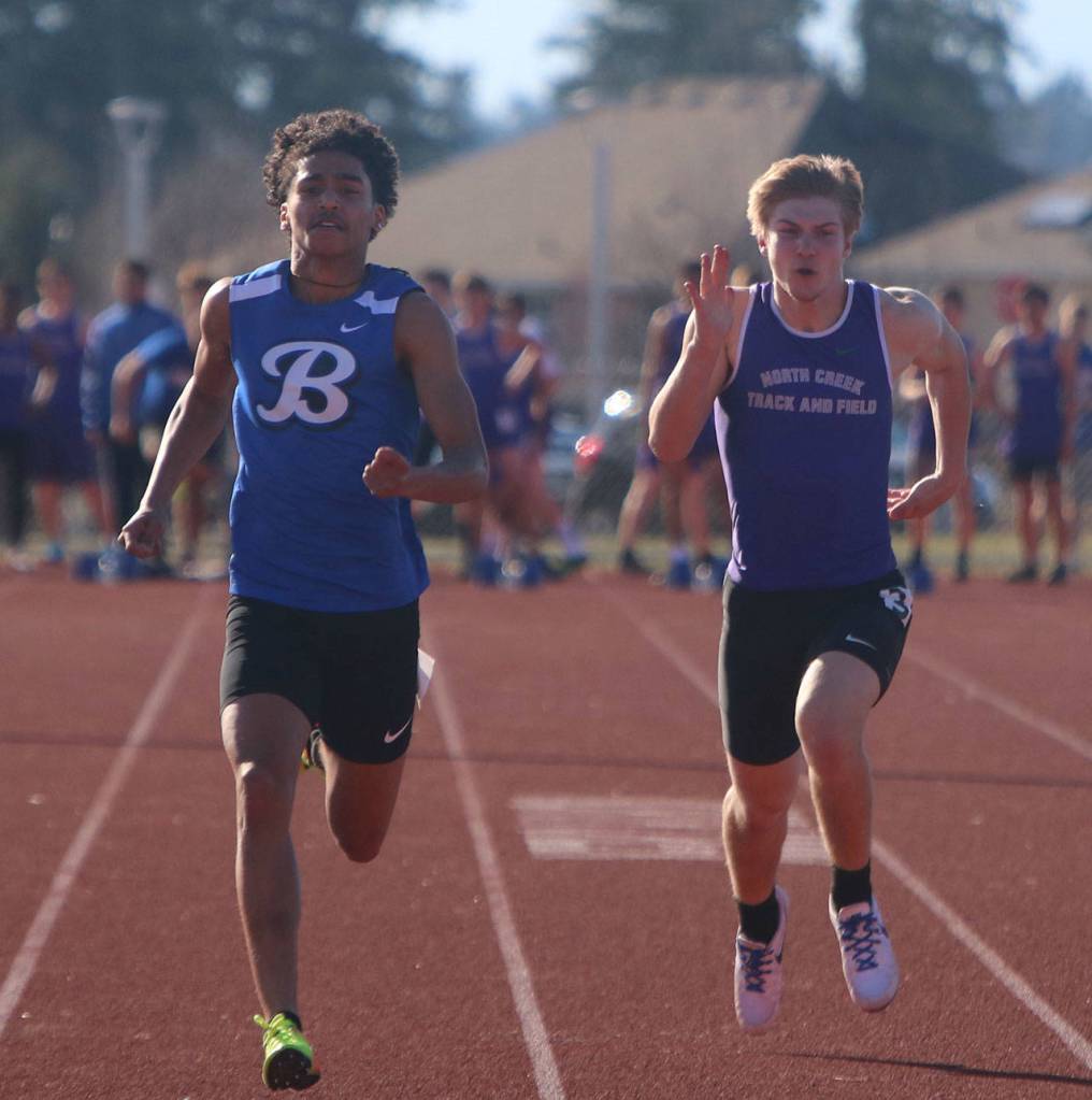 Bothell High’s Myles Phillips, left, speeds to first place in the 100-meter dash in 11.60 seconds on March 20 at North Creek High. Also pictured is North Creek’s Darius Duciuc, who took seventh in 12.13. In team results, Bothell’s boys won, 91.99-52, and Bothell’s girls prevailed, 95-46. Andy Nystrom / staff photo