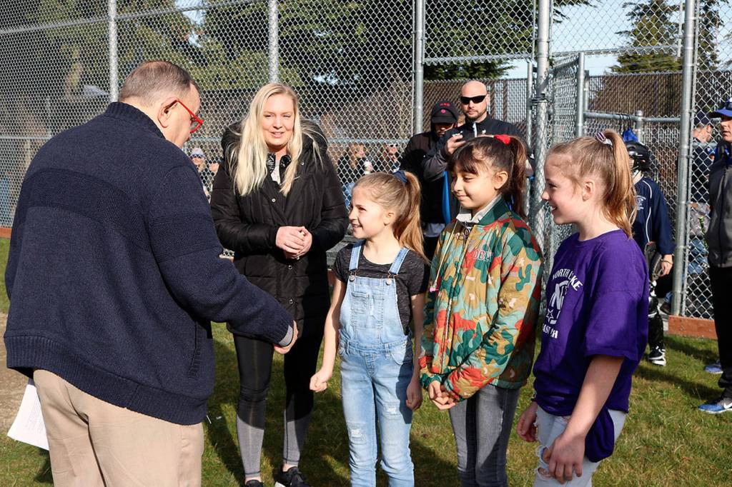 Violet Martinez and her two friends on either side meet Kenmore Mayor David Baker shortly before throwing the first pitch at Moorlands Park. Violet has Lymphoma and has begun to lose her hair after recently finishing her second round of chemo. Photo courtesy of Kenmore