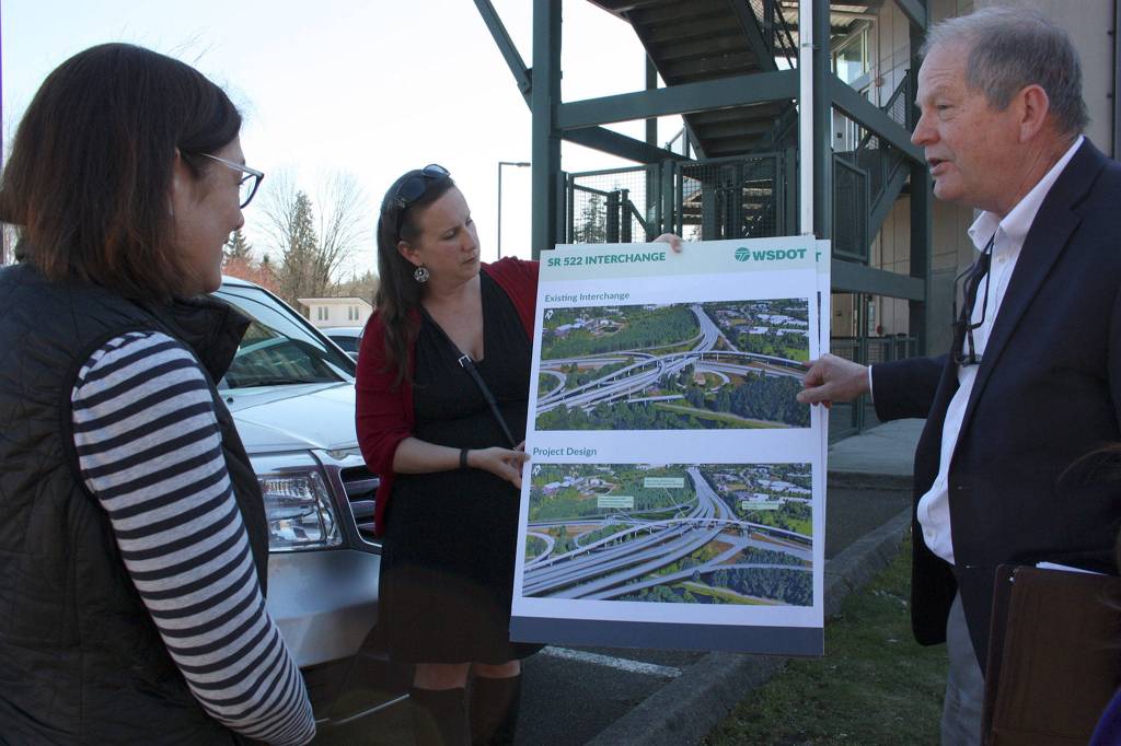 Kim Henry, WSDOT program director for the I-405/SR 167 corridor program, explains the 405-522/527 improvement project in Bothell to Congresswoman Suzan DelBene as Deputy Mayor Davina Duerr looks on. Katie Metzger/staff photo