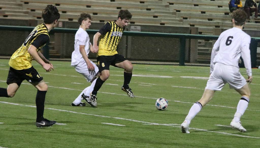 Inglemoor’s Janick Gold (center) controls the ball while teammate Lucas Hakamada trails to the left in the Vikings’ 3-2 loss to Mount Si on April 9 at Pop Keeney Stadium. Nic Grotle scored both Viking goals, one off an assist from Gabe Fahling, and the second by putting in a saved penalty kick. Andy Nystrom / staff photo