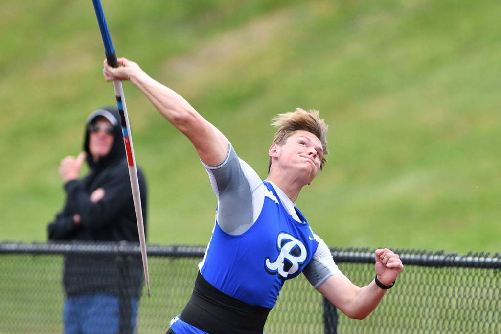 Bothell High’s Sean Witters unleashes the javelin at districts. He won the event with a mark of 170-09. Photo courtesy of Greg Nelson