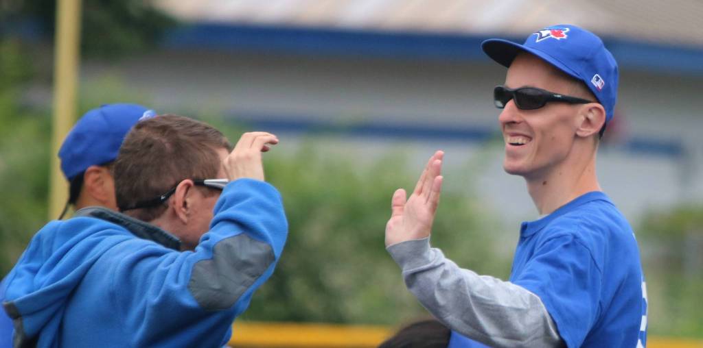 Blue Jays Jason Grager, left, and Doug Broberg have a blast at the Challenger jamboree. Andy Nystrom / staff photo