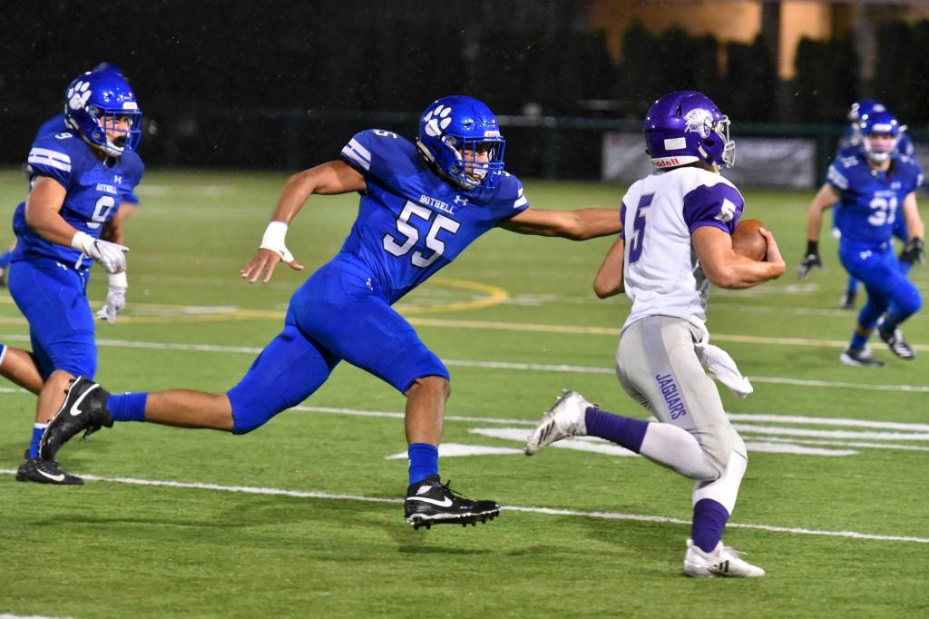 Bothell’s Gabriel Johnson reaches for North Creek’s Jack Charlton on Sept. 27. Photo courtesy of Greg Nelson