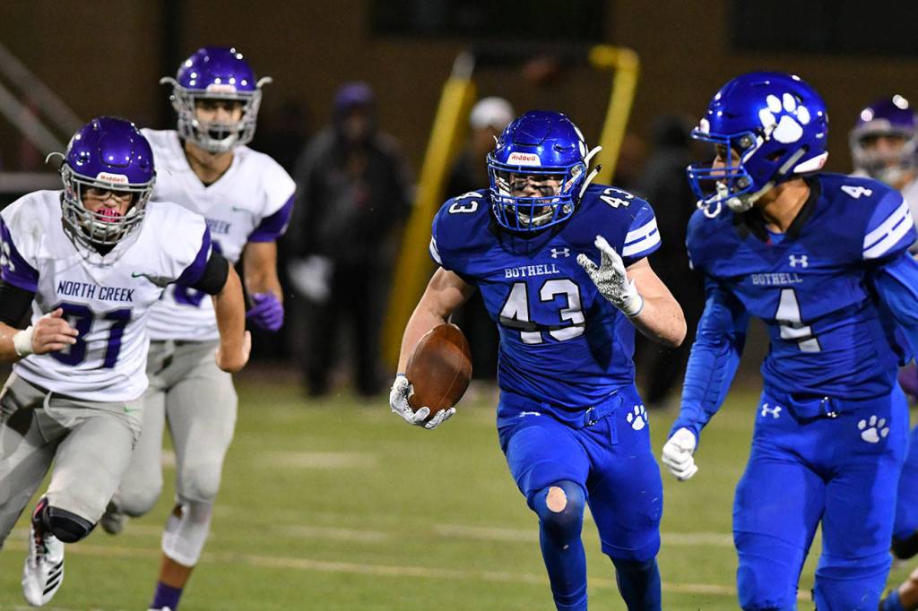 Bothell’s Colin Fisherkeller (43) rumbles up field during the Cougars’ 42-7 victory over North Creek on Sept. 27. Fisherkeller scored twice on runs of 2 and 3 yards. Photo courtesy of Greg Nelson